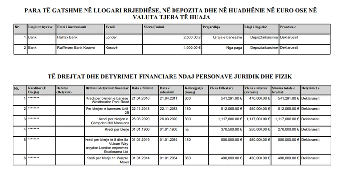 Në anën tjetër, në deklarim figurojnë edhe disa kredi afatgjata të lidhura kryesisht me blerje pronash në Londër, përfshirë Westbourne Park Road, Campden Hill Mansions, Vulcan Way dhe Warple Mews, me vlera që në disa raste tejkalojnë 1 milion euro për një kredi të vetme, dhe afate shlyerjeje që shtrihen deri në vitet 2030–2041 shkruan FrontOnline.